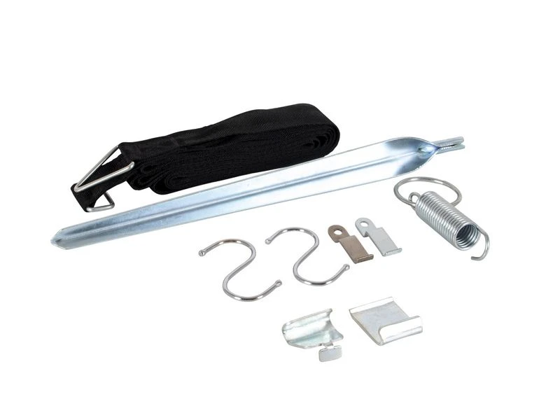 Set bestaande uit 2 nylon banden, 2 veren, 2 stormharingen en 6 stalen haken (2x Ø2,5 cm, 2x Ø3,5 cm en 2x Ø1,5 cm).