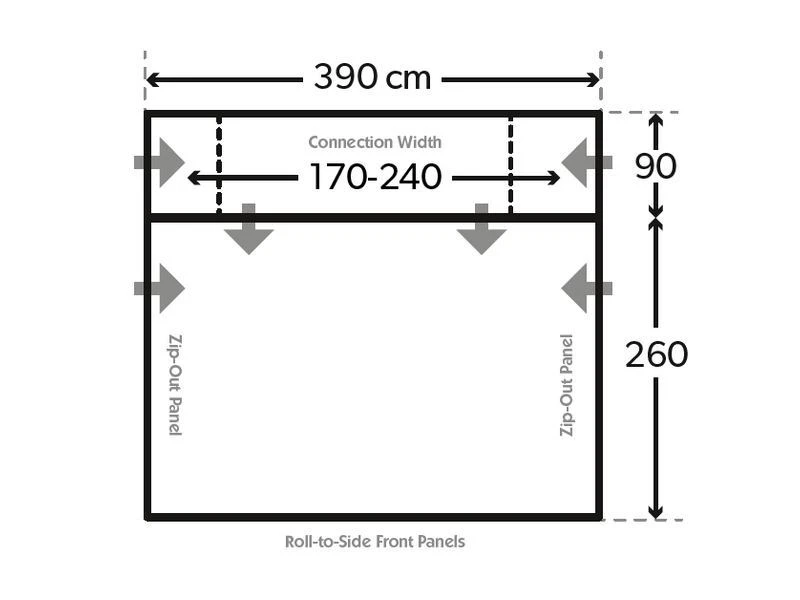 Vrijstaande tent, breedte 390 cm. Hoogte 220-300 cm.