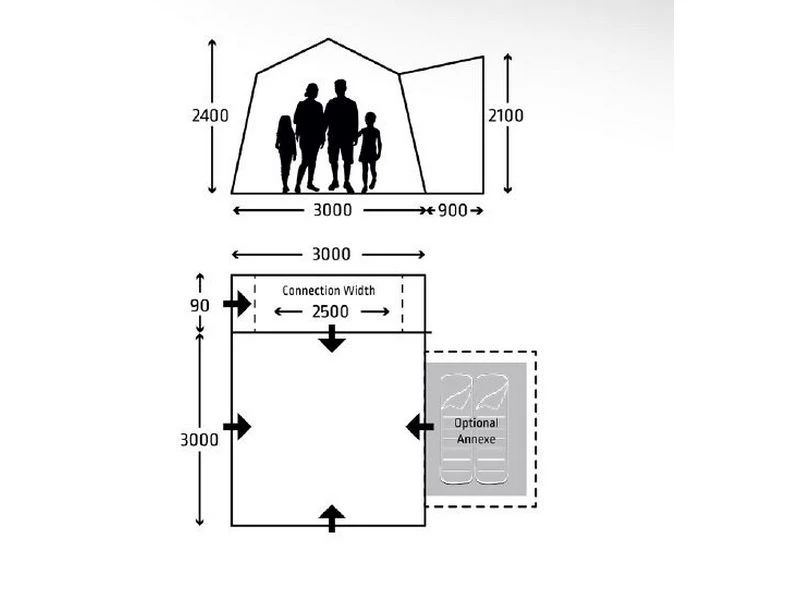 Leveringsomvang: 1 awning; 1 canopy pole; 1 2L pump; 1 peg pack; 1 manual; 1 carry bag